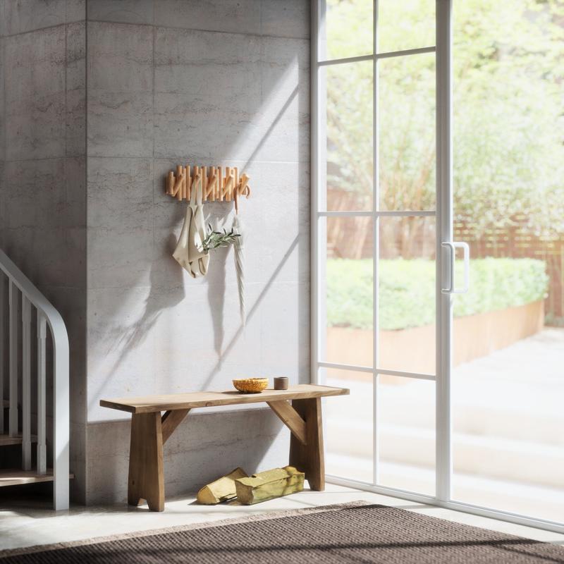 Picket has five hooks that flip down when needed to easily hold up to 5 lbs. each. When not in use, the hooks can flip back up, creating a seamless profile that makes Picket look like an interesting piece of art.
