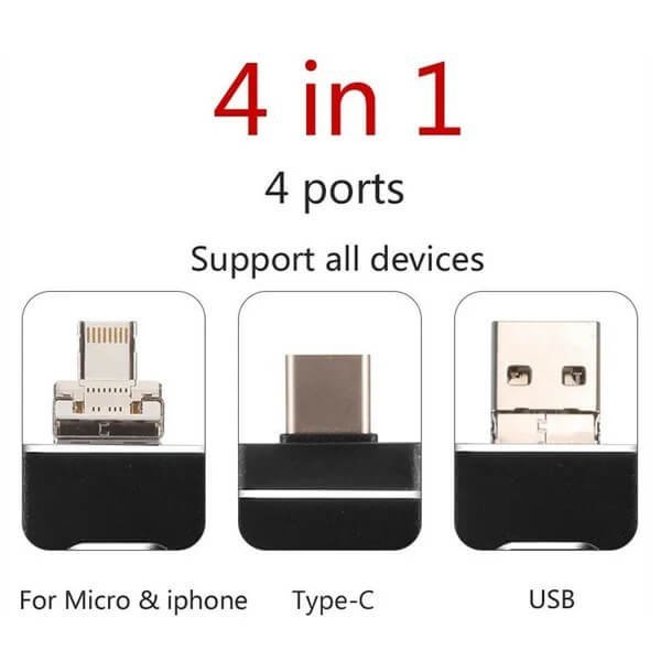 Uses 4-in-1 linker & push-pull design, which is more convenientfor data transfer between different devices: Lightning connector for iPhone, iPad, USB 2.0 for PC, Micro-USB, Type C connector for Macbook, Android.